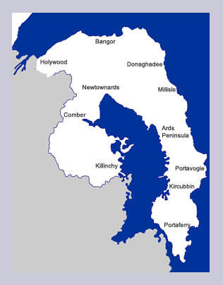 Newtownards, Ardkeen, Ballyhalbert, Ballywalter, Carrowdore, Cloughey, Greyabbey, Kircubbin, Millisle, Portaferry, Portavogie. |